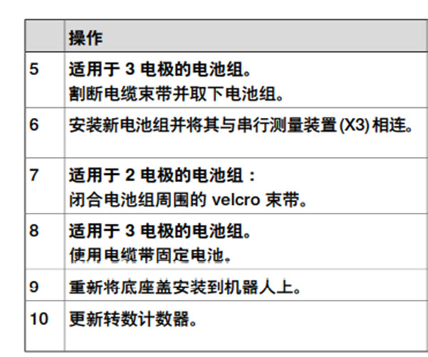 注意:當(dāng)需要更換電池時,將會顯示電池低電量警告(38213 電池電量低)。建議在電池 更換完畢前保持控制器電源打開,以避免機器人不同步。 對于具有 3 電極觸點的 SMB 電路板(RMU101 3HAC044168-001 或 RMU102 3HAC043904-001),新電池的壽命通常是 36 個月。 對于具有2極電池觸點的SMB板,如果機械手斷電2天/周,新電池的通常壽命為36個 月;如果機械手斷電16小時/天,則為18個月。通過電池停機維護程序,可延長壽命 以延長生產(chǎn)中斷時間。
